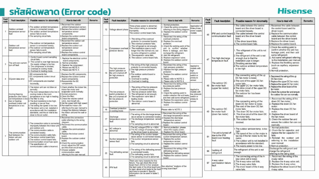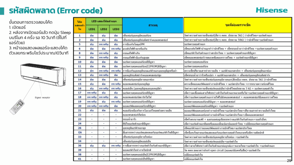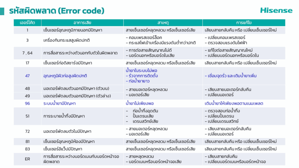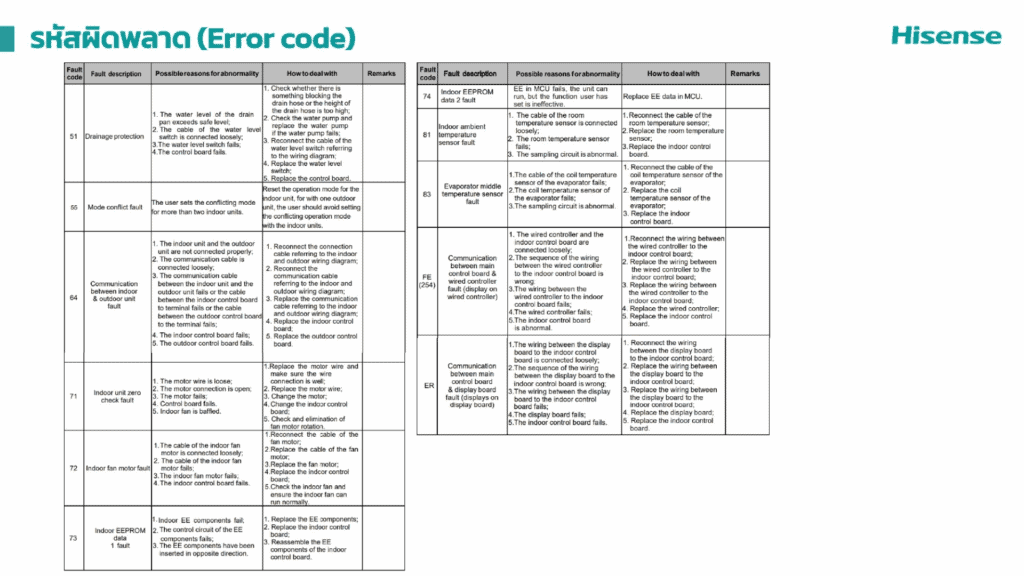 บทความนี้เรารวบรวม Error ของเครื่องปรับอากาศ โดยจะมีสองประเภทหลักๆคือ แอร์ Wall Type และแอร์ กลุ่ม Cassete Type หรือ Ceiling type ซึ่งเป็นที่สำคัญกับช่างที่ซ่อมสินค้า Hisense